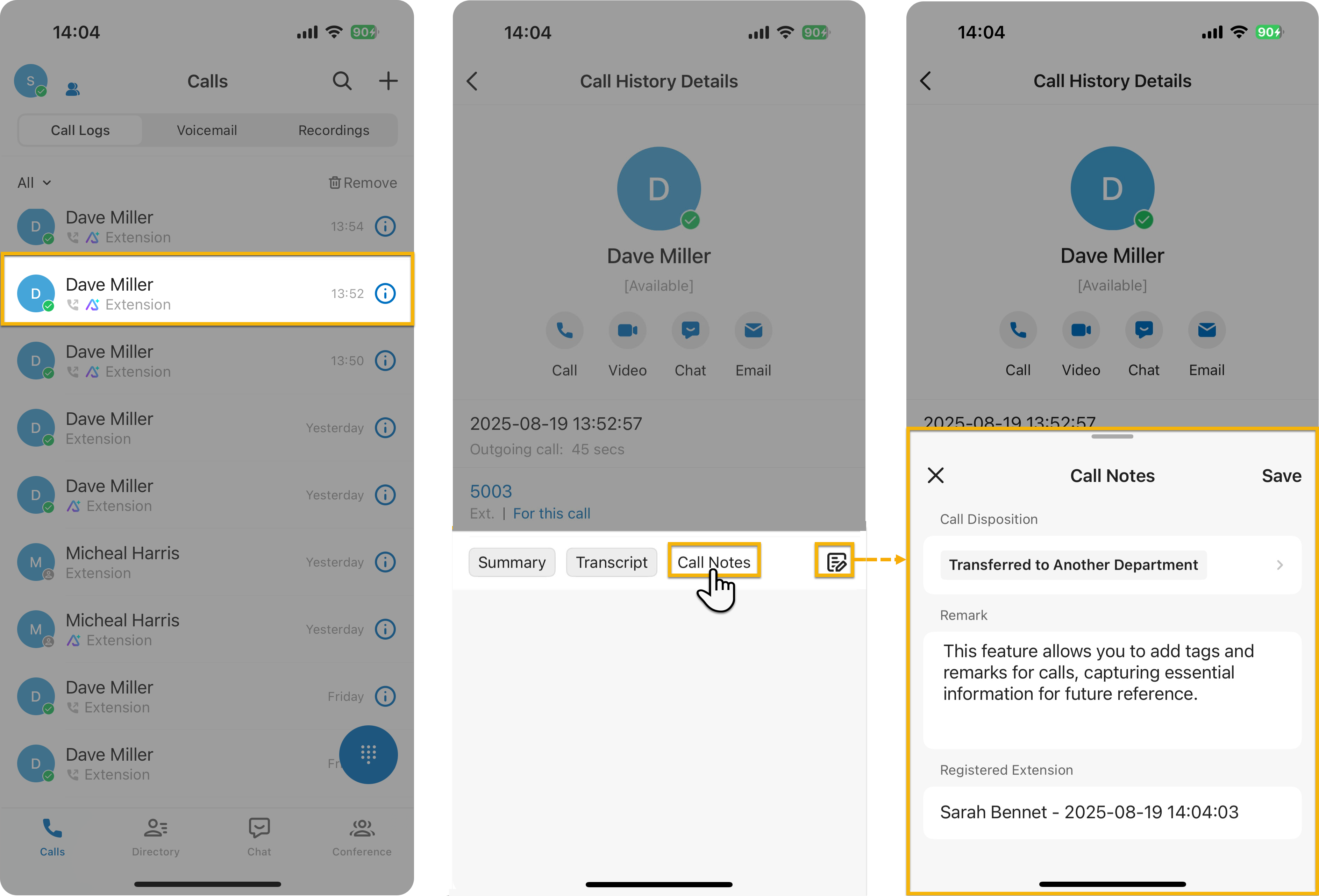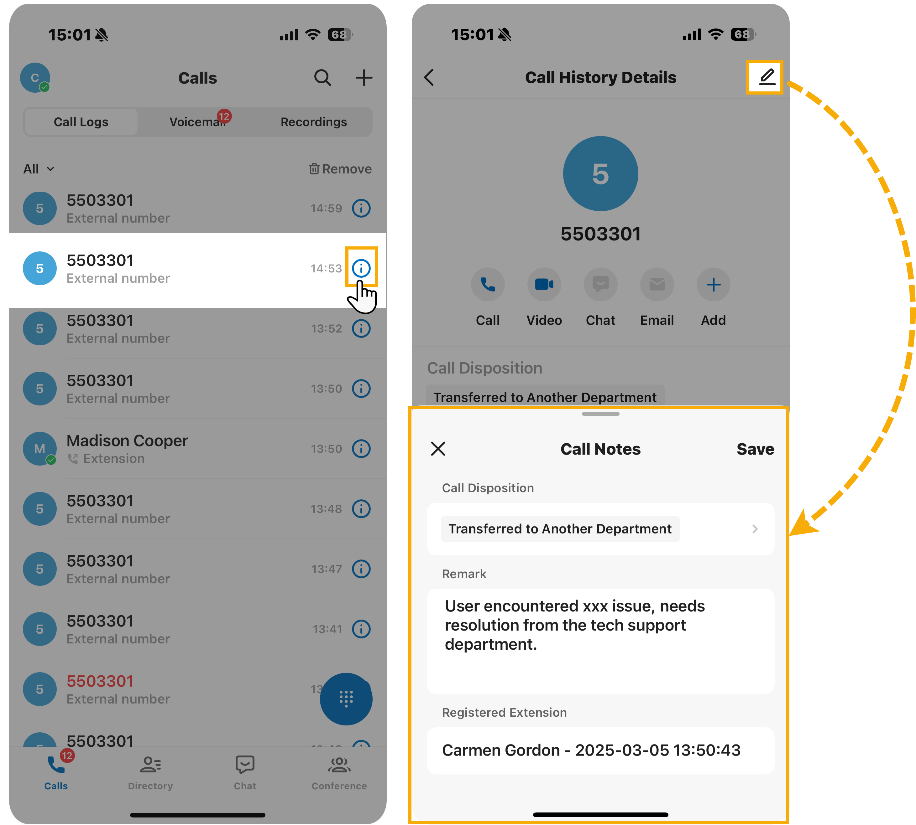 . - In the Call Notes panel, edit the call note as needed, then tap Save.