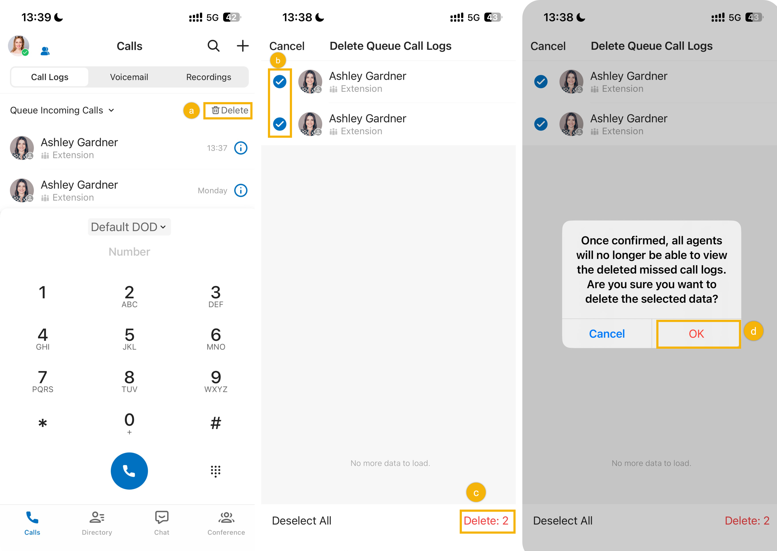 Delete incoming call histories Note: Only supports to delete the logs of queue calls the you have answered.- To delete a single call log, swipe left on the desired call log, then tap Delete.
