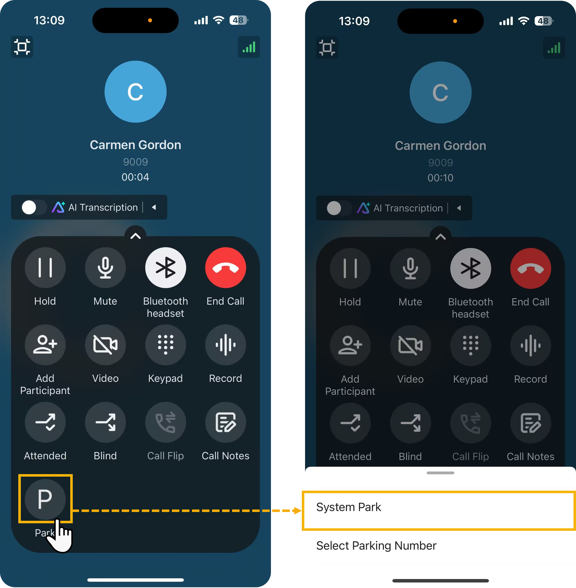 During an active call, you can directly tap on the call screen to park the call on a system-assigned or manually selected parking number.