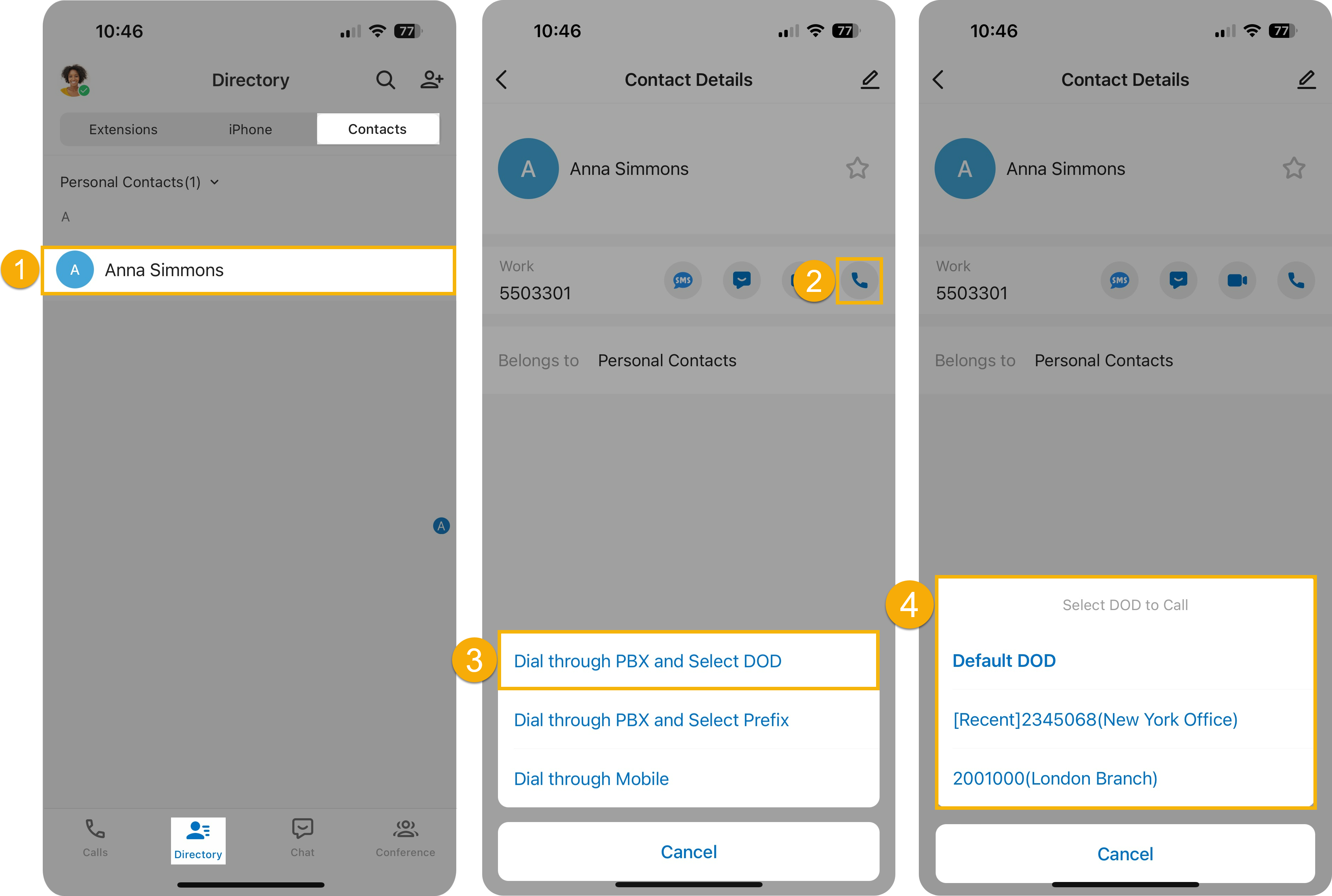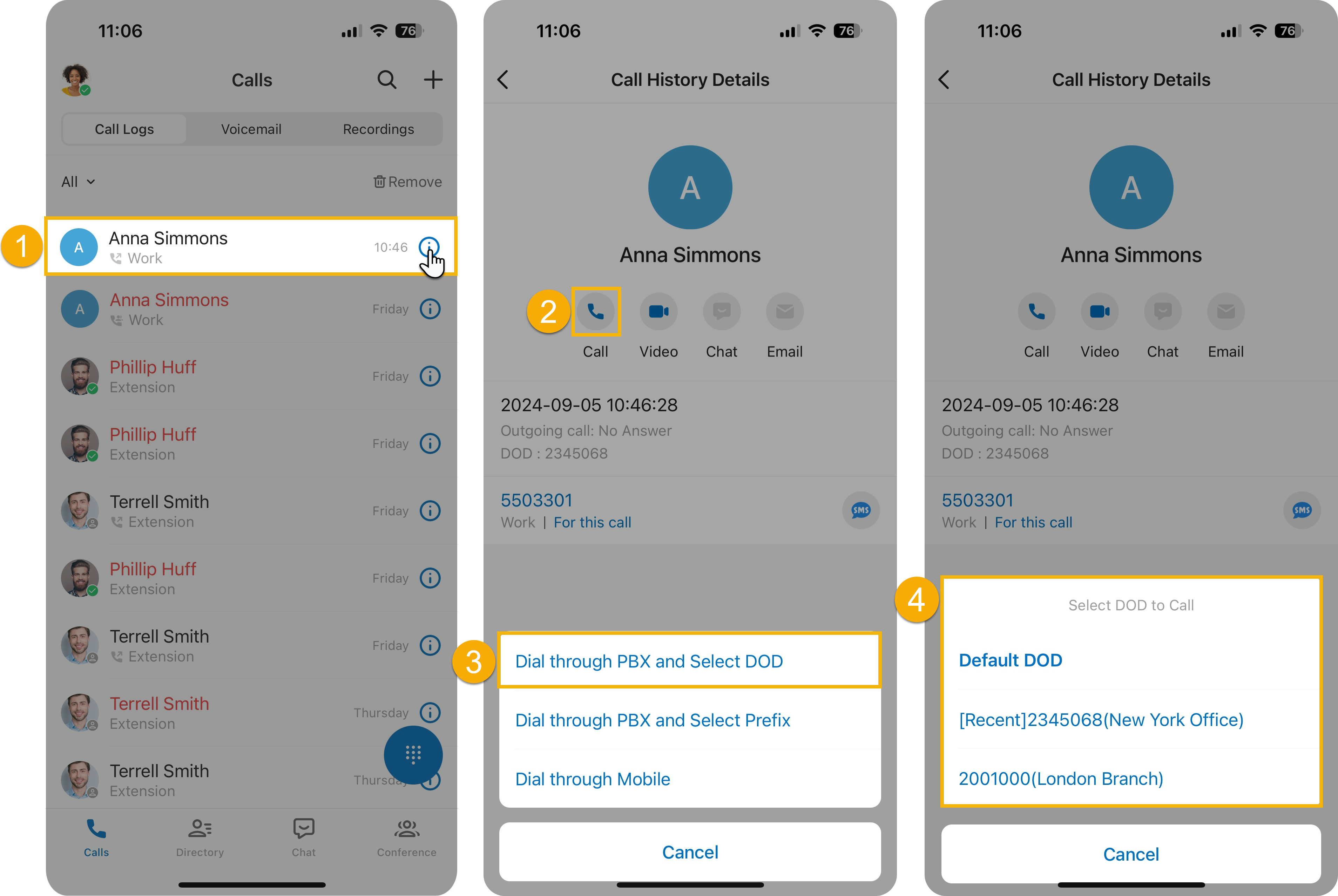 By default, the DOD number configured by system administrator is used when you make outbound calls. You can choose to use the same DOD number for all outbound calls or select a specific DOD for each call.