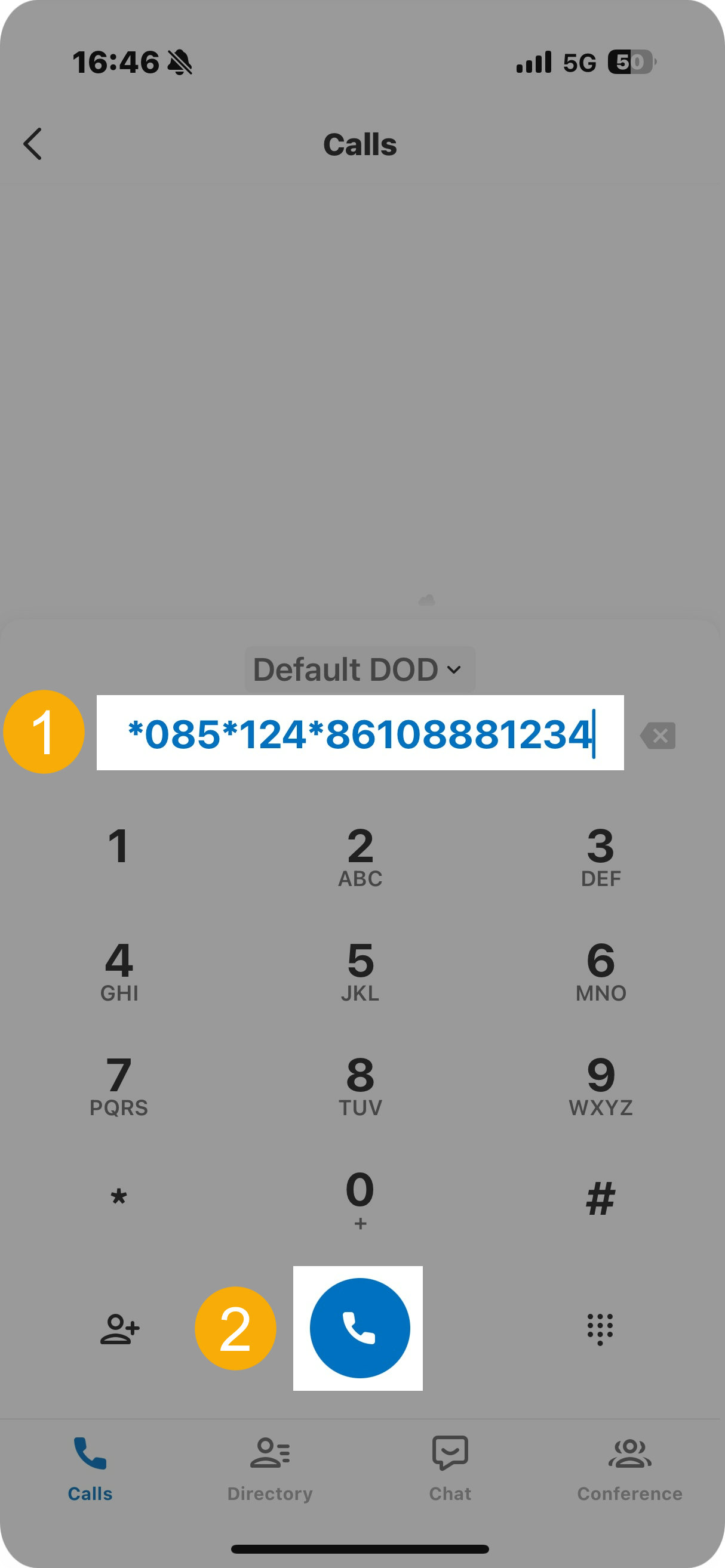 Note: To use this method, you need to obtain a DOD prefix feature code and the short code of the specific DOD number from your system administrator.- In the Dialpad, enter the feature code