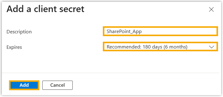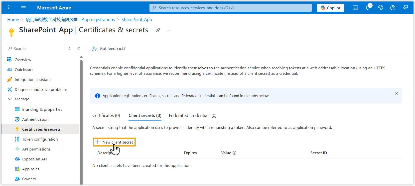 - On the left navigation bar of the Microsoft Entra application, go to Manage > Certificates & secrets > Client secrets, then click New client