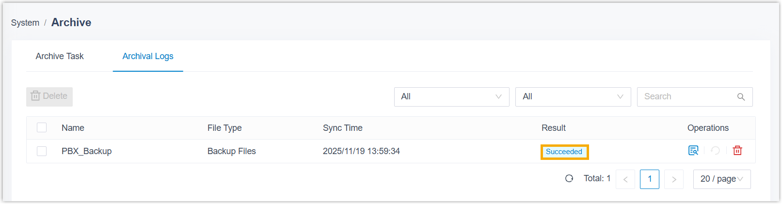- On PBX web portal, go to System > Archive > Archival Logs. If the Result column of the task shows Succeeded, it indicates that the specified files have been successfully archived to Microsoft SharePoint.