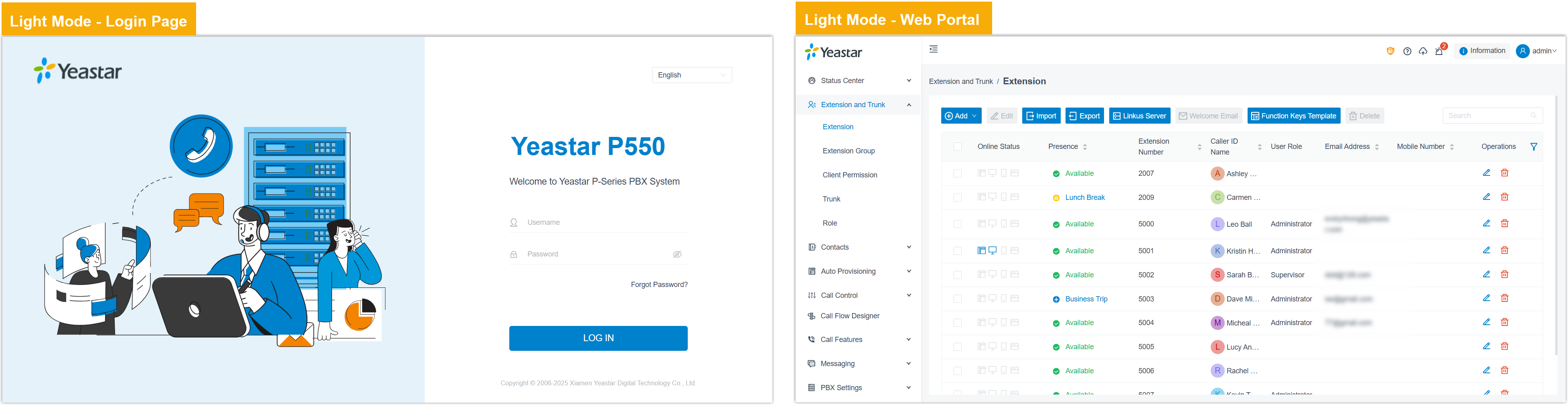 By default, the PBX web interface automatically matches your browser’s theme, switching between light and dark modes accordingly. You can also manually set the PBX to use a fixed light or dark theme, regardless of your browser’s settings.