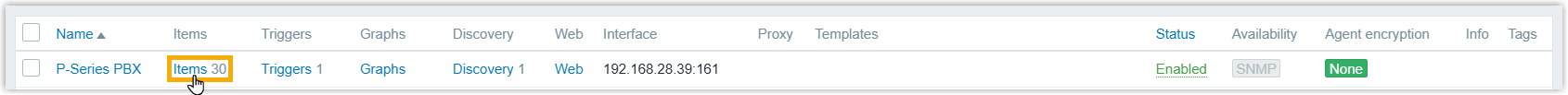 A monitoring item defines a single metric or the kind of data to collect from a host. In this example, we will add monitoring items to collect data from the PBX host.