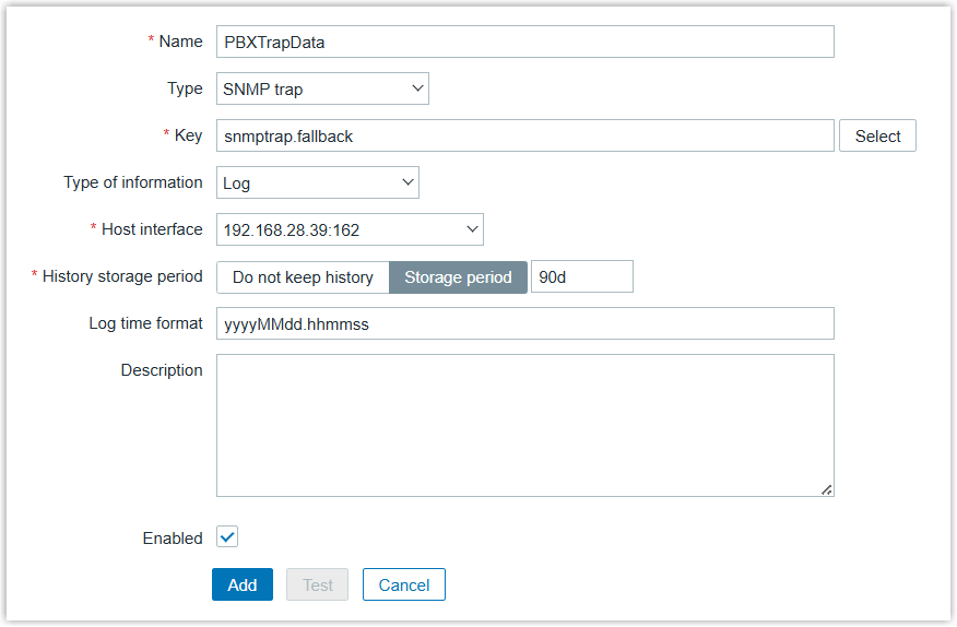 Type Select SNMP trap. Key Enter a unique key for the item. In this example, enter snmptrap.fallback.