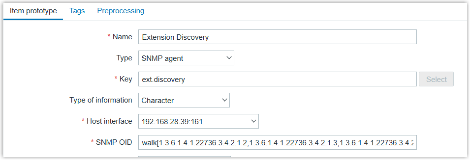 In this example, enter ext.discovery.Type of information Select Character. Host interface Select the host interface used for SNMP queries. SNMP OID Enter the OID used for SNMP data collection. The expression format varies depending on the Zabbix version: