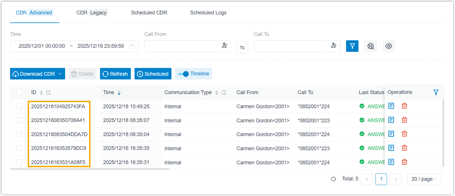 -,=,<,<=,>,>=, and number ranges to specify a range. - You can obtain CDR ID from the CDR