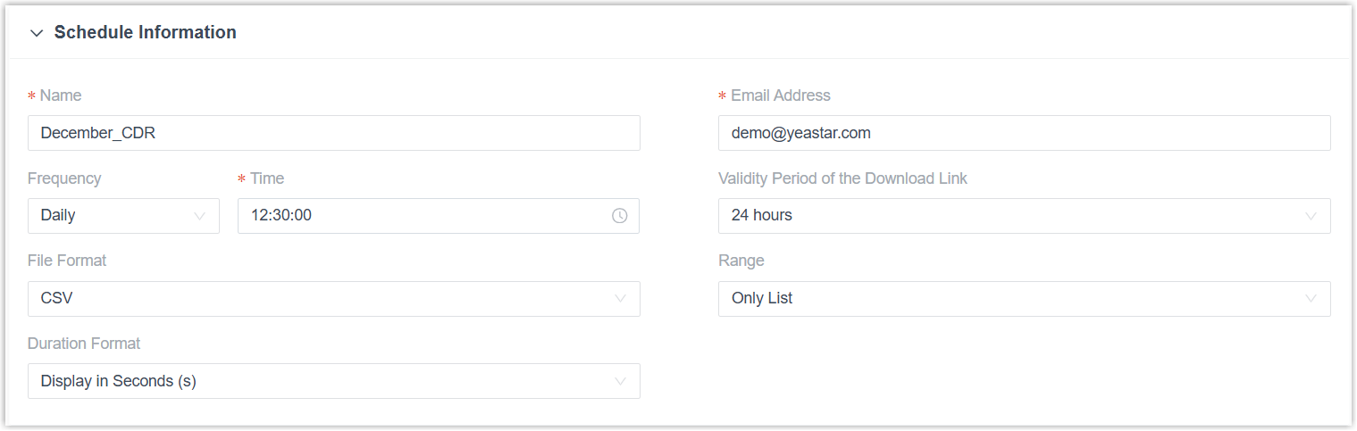 Validity Period of the Download Link Set the validity period of the download link for the scheduled CDR. After the link expires, the recipients can NOT access and download the CDR via the link.