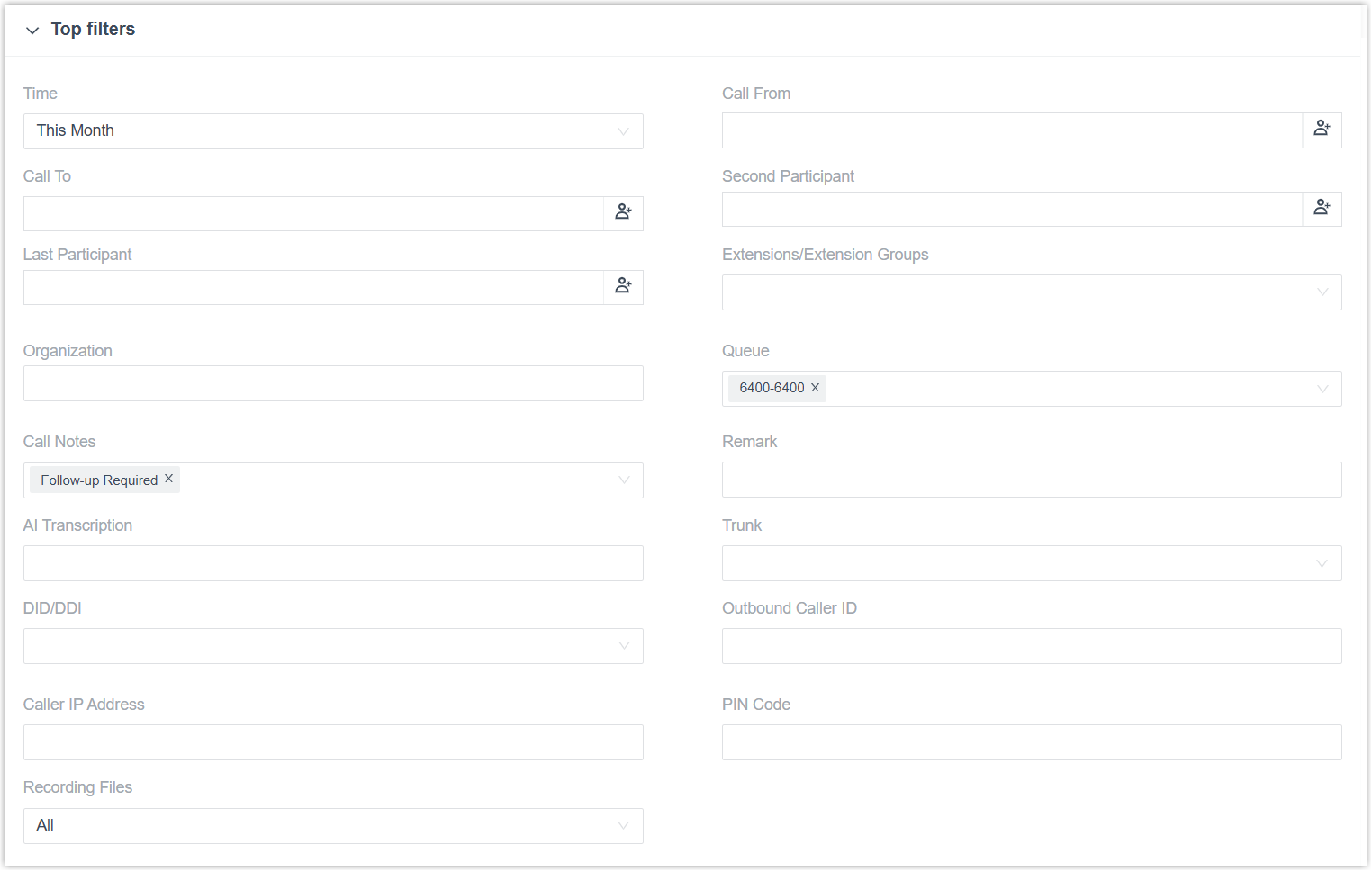 extension group(s), organization(s).Extensions/Extension Groups Select extension(s) or extension group(s). Organization Select department(s). Queue Select queue(s). Call Notes Select disposition codes. Remark Enter the remark added in the last call leg. AI Summary Enter keywords from the AI summary content. Trunk Select a trunk. DID/DDI Select DID number(s). Outbound Caller ID Enter the Outbound Caller ID. Caller IP Address Enter the caller's IP address. PIN Code Enter the PIN code. Recording Files Select an option to include all CDRs, CDRs with recordings, or CDRs without recordings. - In the Schedule Information section,