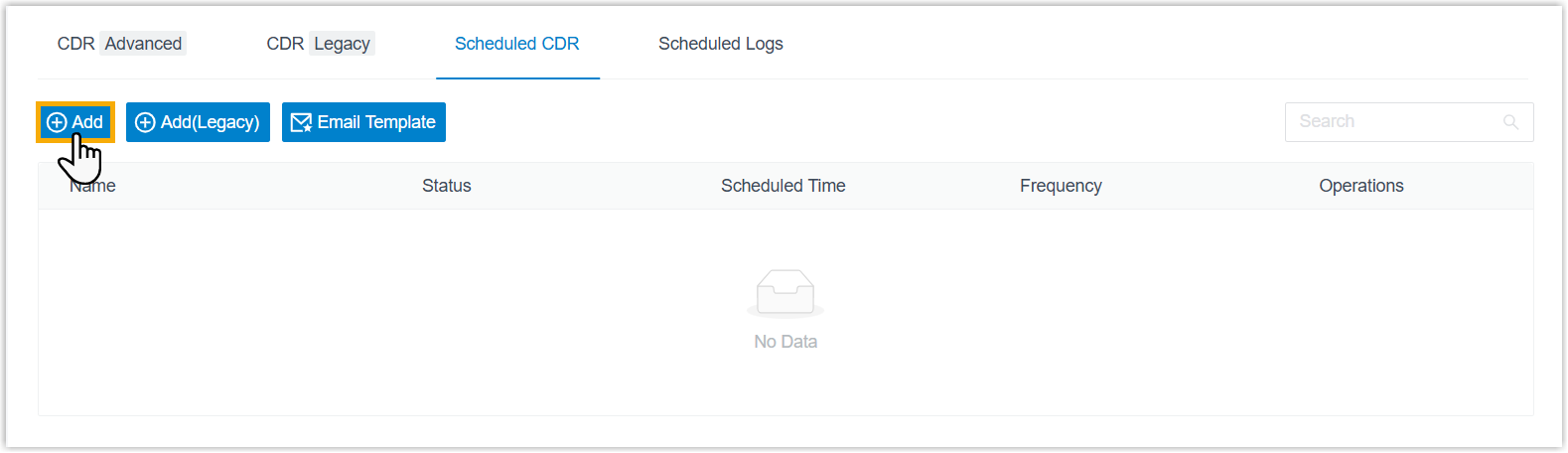 Note: To enhance system performance, Yeastar has upgraded the CDR module in version 37.21.0.117 with a new data structure for clearer display and more comprehensive call details. The system gradually deletes old CDRs according to the CDR Auto Cleanup setting. Before old CDRs are cleaned up, new and historical data are managed separately - the Add button for new data and the Add (Legacy) button for historical data.This topic describes how to schedule new CDR data generated after upgrading to version 37.21.0.117 or later. To schedule historical data, click Add (Legacy) button to proceed.