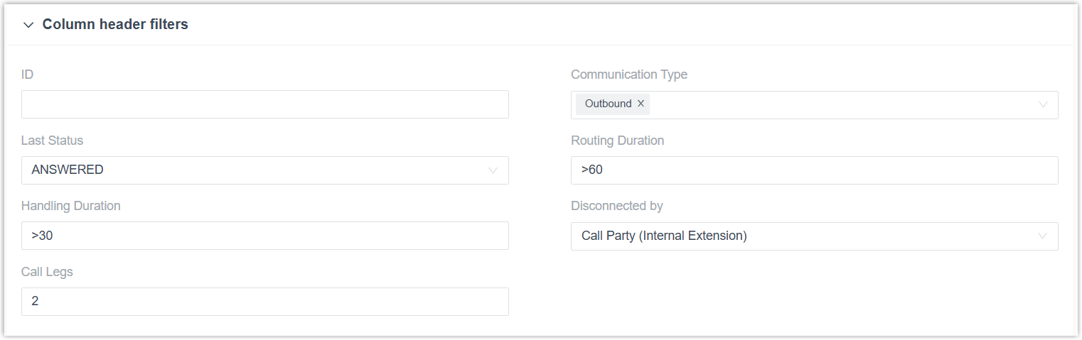 Note: For calls with multiple call legs, the final status of the last call leg is used for filtering.Routing Duration Specify the time between the call stared and the call answered. You can enter numbers,