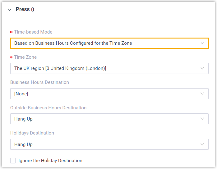 - Holidays DestinationNote: If you want to route incoming calls based on custom business hours and non-working hours during holidays, select the checkbox of Ignore the Holiday Destination.