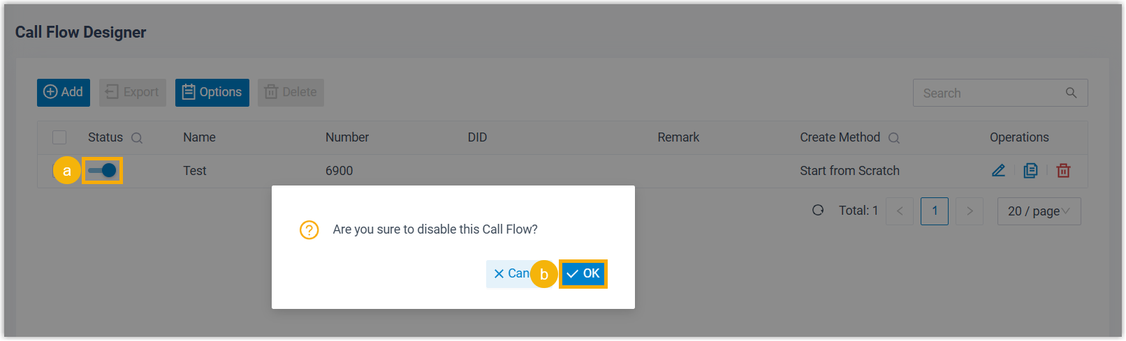 When a call flow is disabled, incoming calls to the call flow number or the associated DID number will be automatically disconnected.