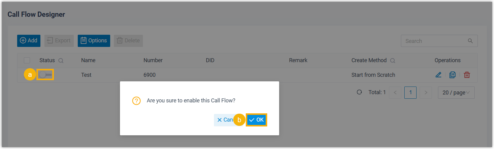 When a call flow is enabled, incoming calls to the call flow number or the associated DID number will be routed to the call flow.
