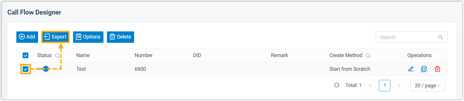 - Select the checkbox(es) of the call flow(s) that you want to export, then