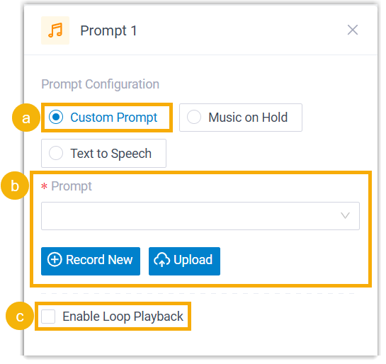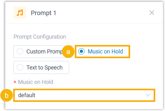 Prompt Type Description Custom Prompt Choose from existing custom prompts, or create a new one by recording with an extension or uploading an audio file. Music on Hold (MoH) Choose from existing MoH. Note: Before you begin, make sure the desired MoH is configured in .