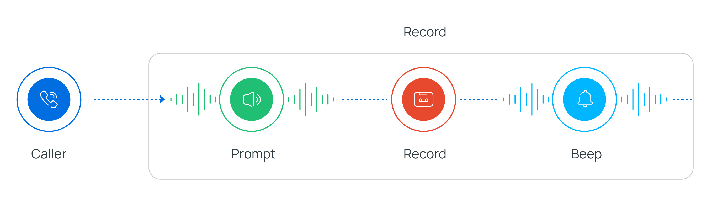 Record component allows you to start recording a call upon the caller being connected to another participant, and optionally configure prompts to inform call participants at the start and during the recording.