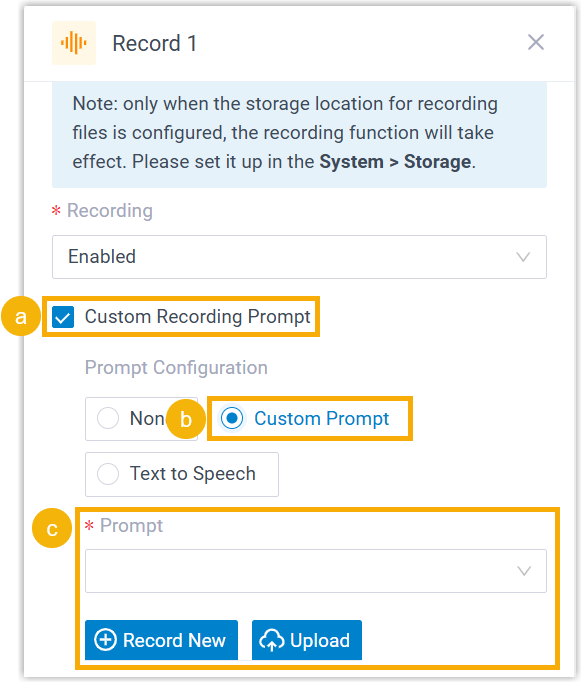 3. If call recording is enabled, you can configure prompts to inform call participants of the recording.