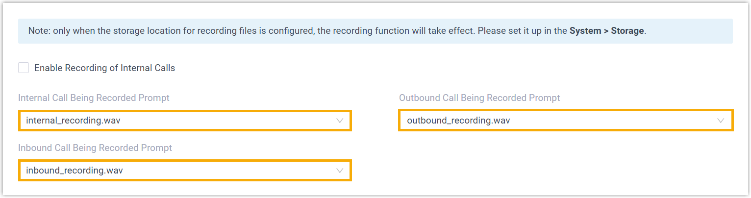 • If no custom prompt is configured, the system will use the global prompt for recording (Path: Call Features > Recording), if available.