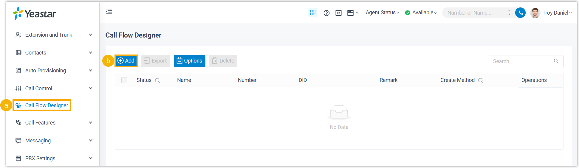 1. Log in to PBX web portal, go to Call Flow Designer.