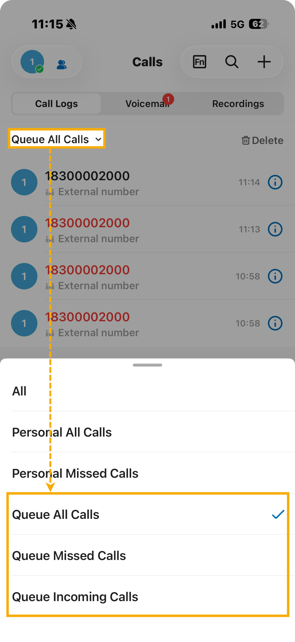 The authorized agents are able to view queue call logs on their Linkus UC Clients (Path: Call Logs).