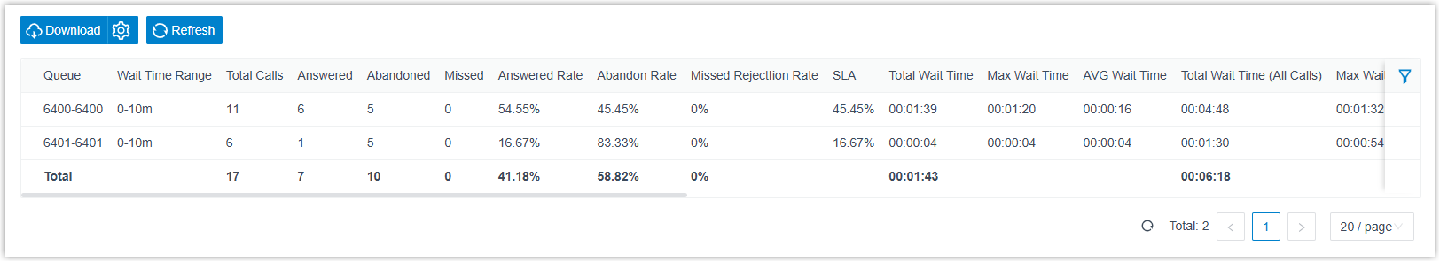 | Total Wait Time | The total waiting time of answered queue calls before being connected to an agent. |