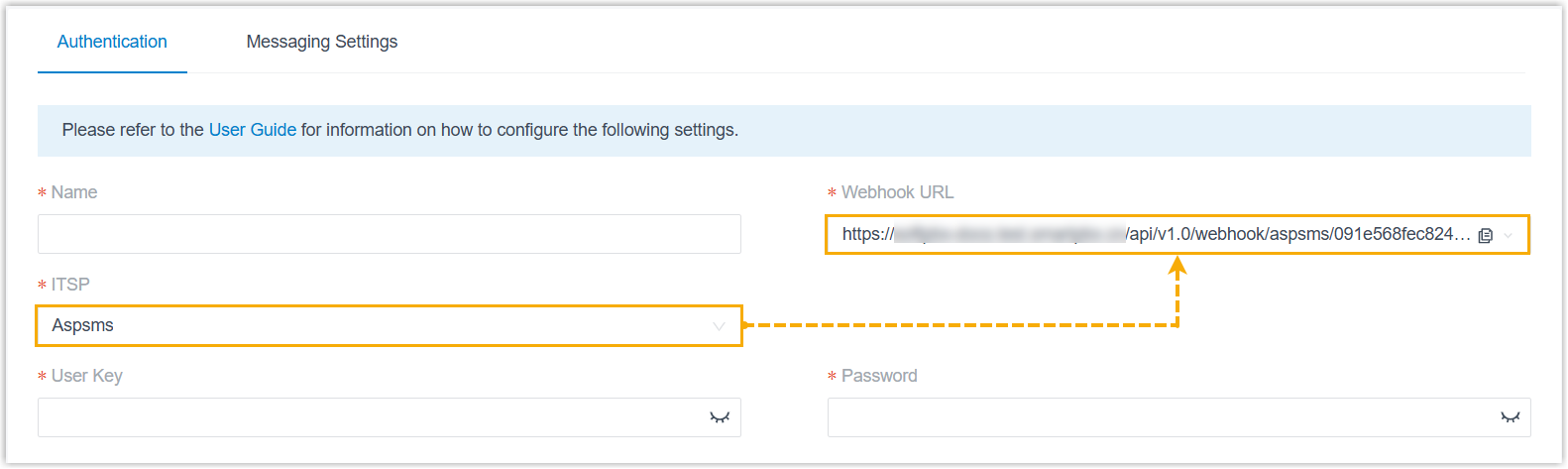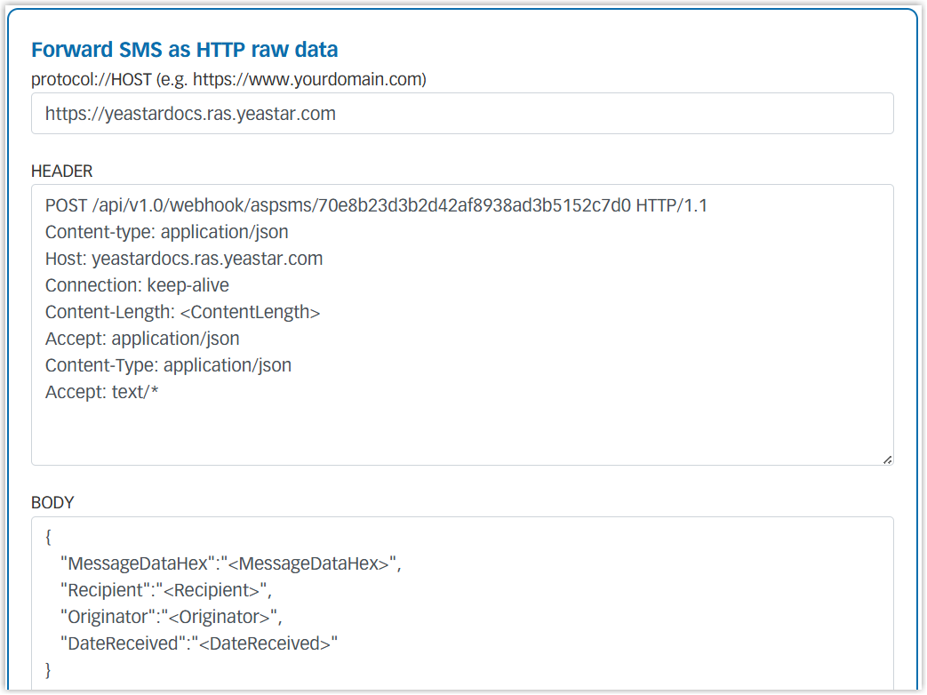 https://yeastardocs.ras.yeastar.com/api/v1.0/webhook/aspsms/091e568fec824f52bb9e83abe68f7693, then the {{Webhook Path}} is/api/v1.0/webhook/aspsms/091e568fec824f52bb9e83abe68f7693. - {{PBX domain}}: The domain name of
