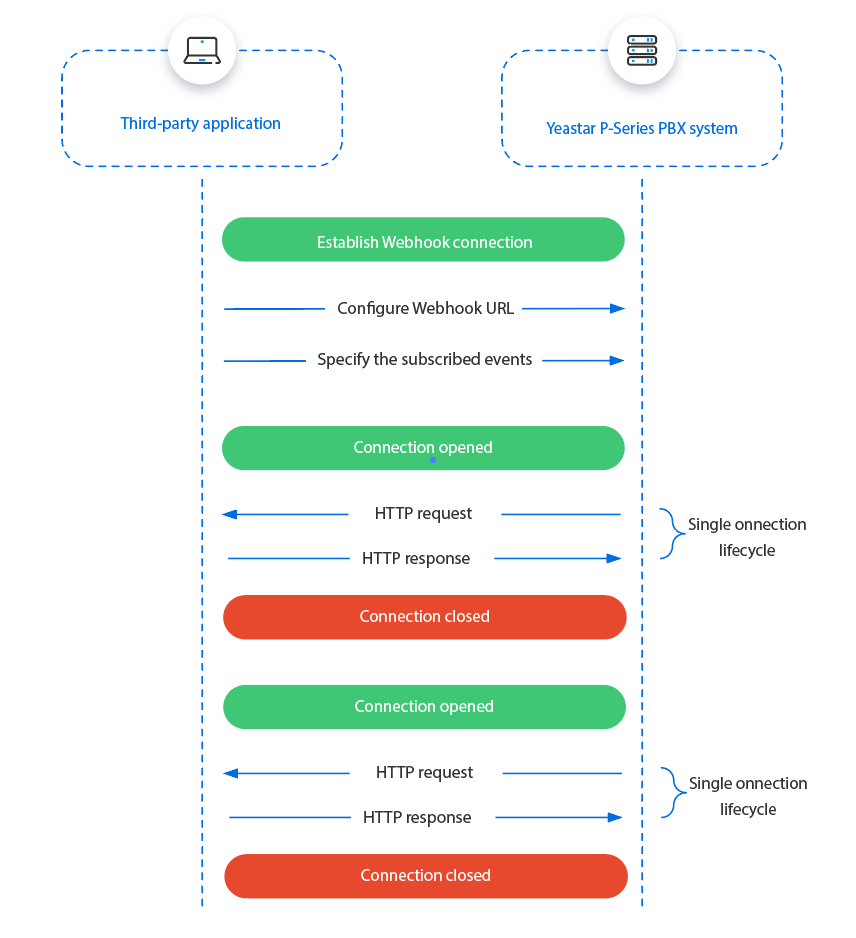 After the third-party application establishes WebSocket connection with Yeastar P-Series PBX System and subscribes to desired events, it will receive event-driven responses without having to poll the PBX for a reply, thus achieving real-time monitoring. For more information, see Monitor Events via WebSocket.
