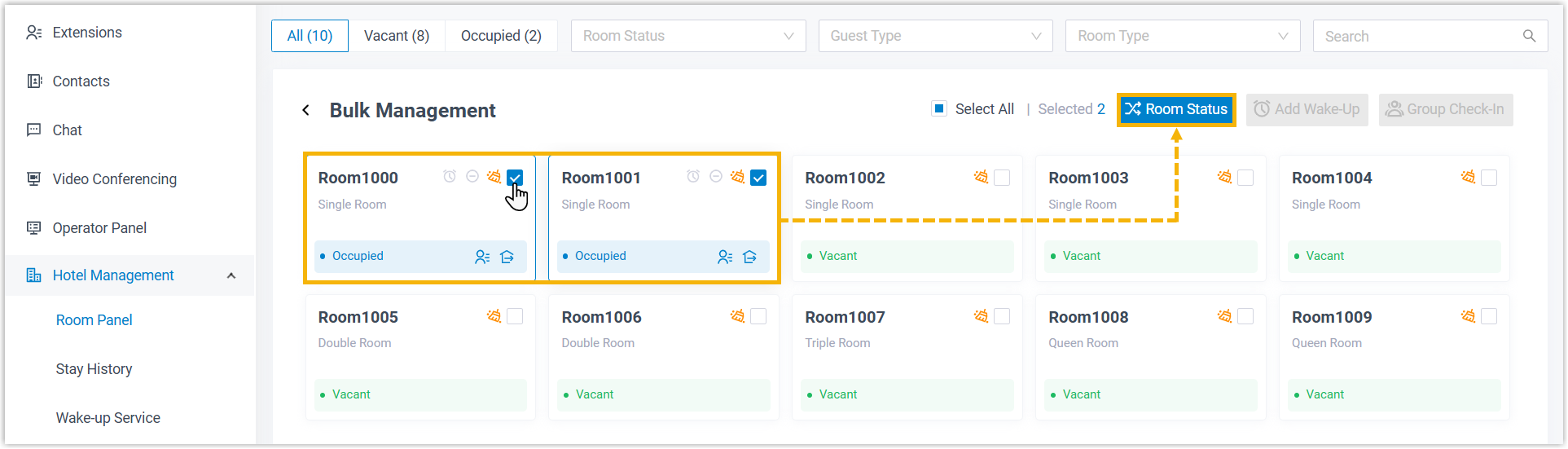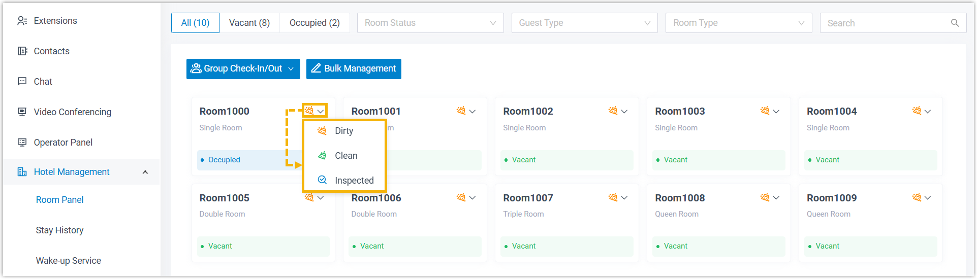This topic describes how to change the status of guest rooms from Room Panel on Linkus Desktop/Web Client, so as to stay updated on rooms' condition.
