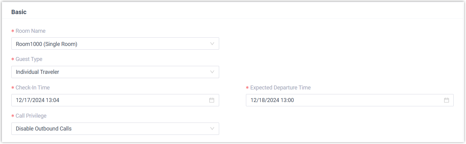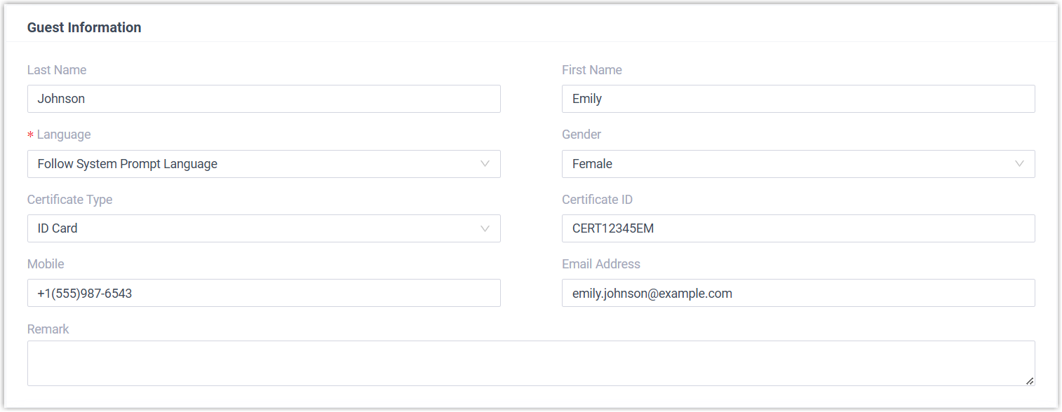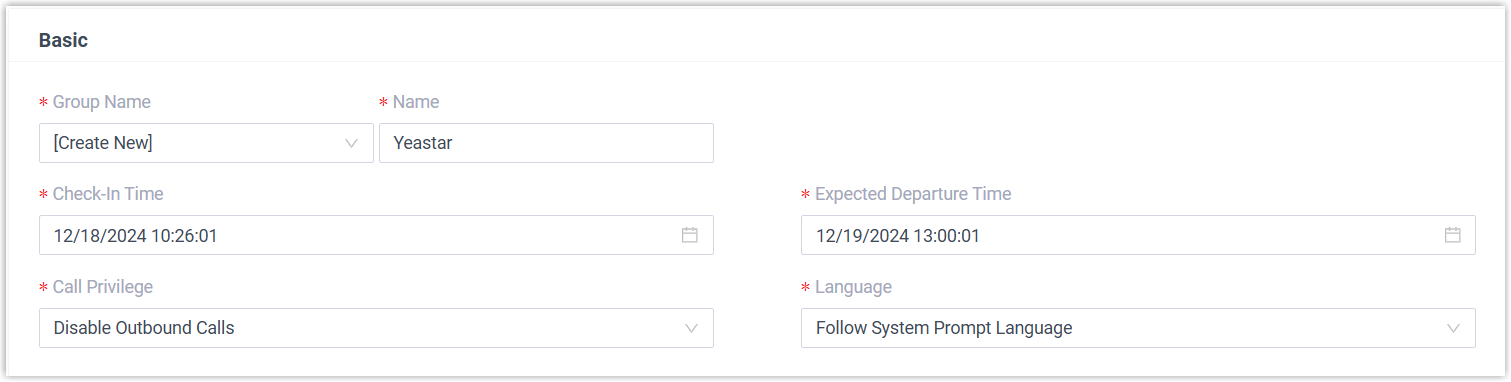 Note: Language determines the language in which system prompts (e.g. wake-up call, voicemail, or IVR) will be played to the guest.