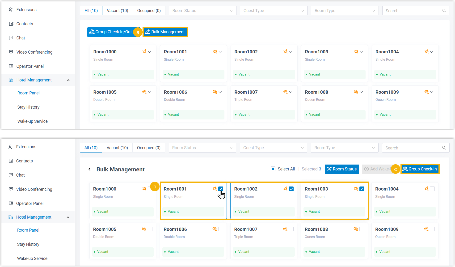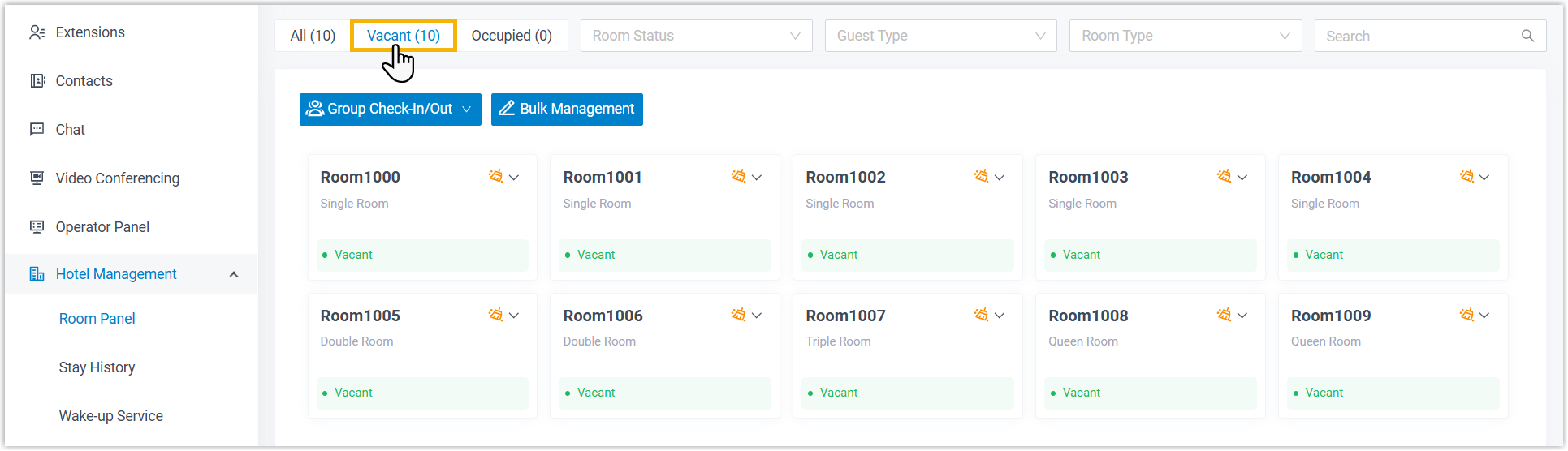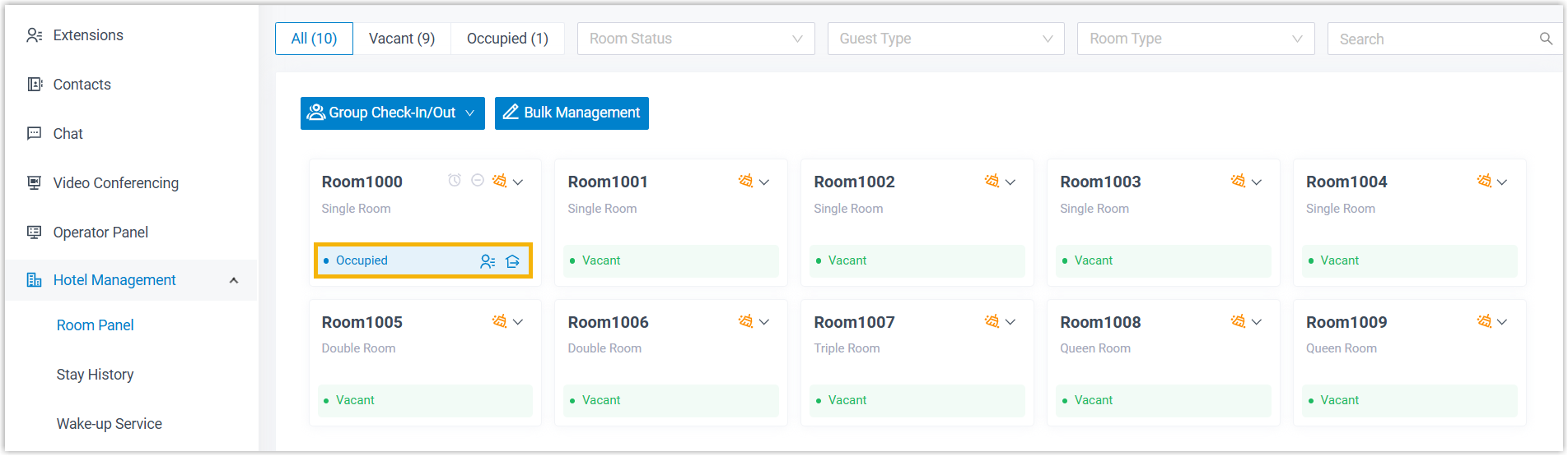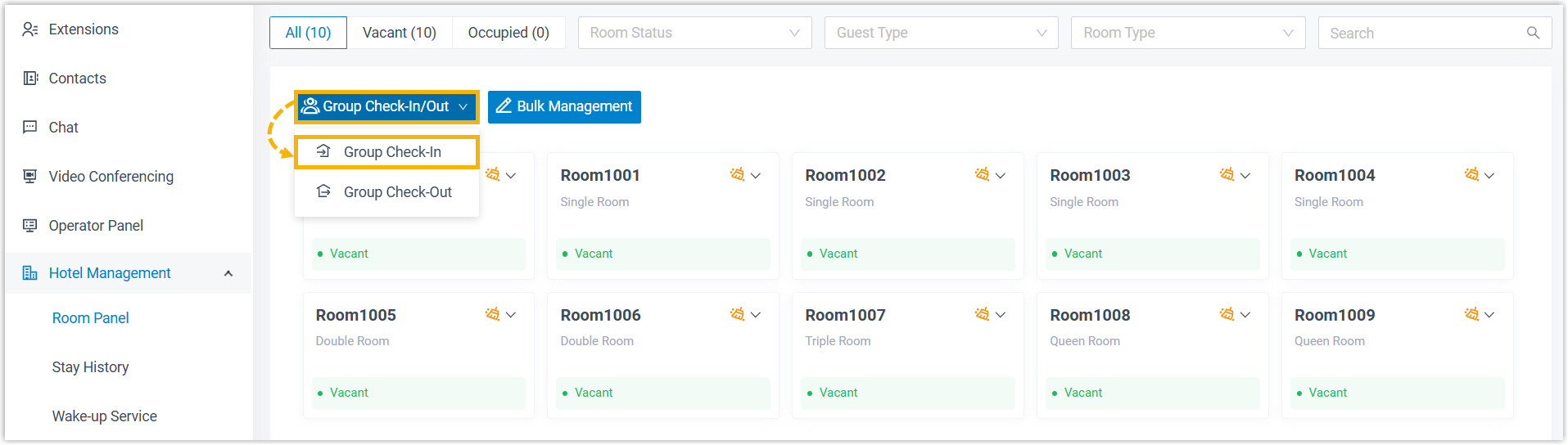 1. Log in to Linkus Desktop/Web Client, go to Hotel Management > Room Panel.