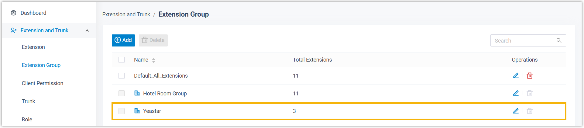 • A temporary extension group is automatically created, and all extensions associated with the guest rooms assigned to the tour group are added to it for centralized call permission assignment.