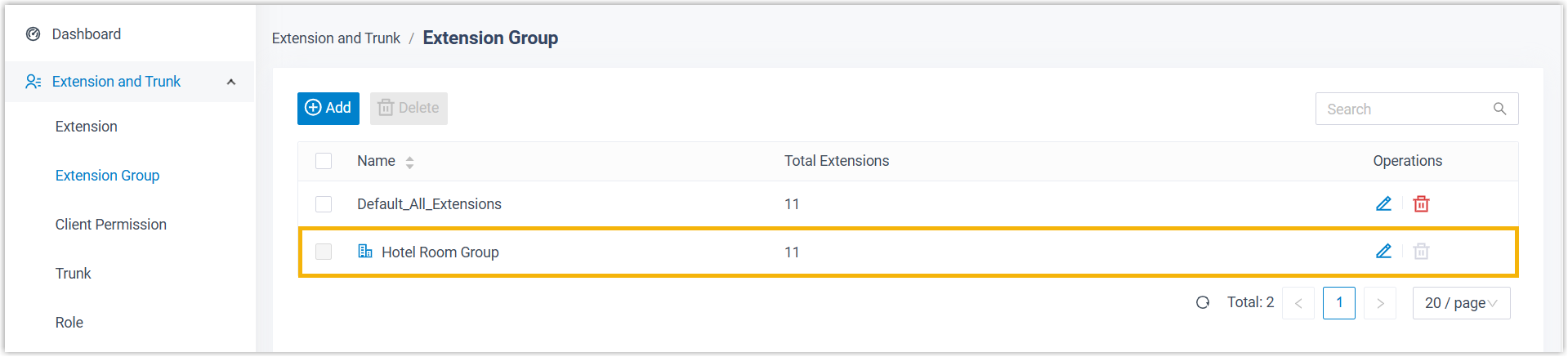 Yeastar P-Series PBX System implements group-based control over users' call management permissions. After you enable hotel management on PBX, an extension group Hotel Room Group is automatically created, and all extensions assigned to guest rooms will be added to the group.