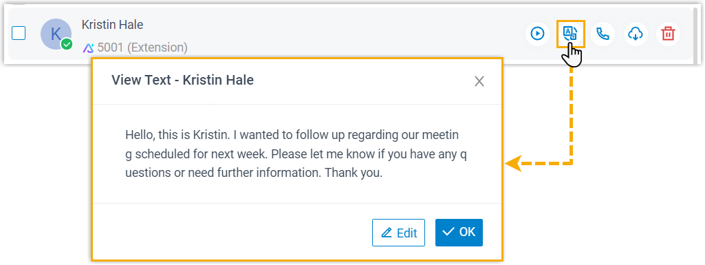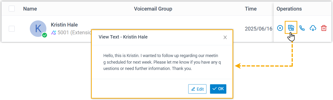 Users can view the transcribed text for each voicemail on their Linkus UC Clients (Path: Voicemails). The transcribed voicemail messages are marked with an icon .