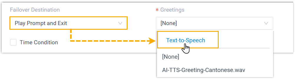| Queue | Set a prompt for failover destination, including both default and time-based destinations (Path: ). | ![]() |