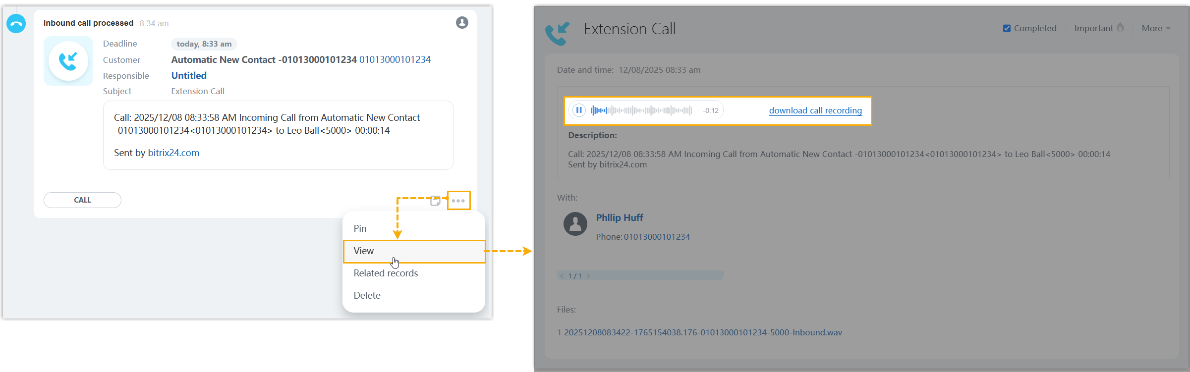- Users can log in to Bitrix24, go to or in a contact detail page to view the call logs.
