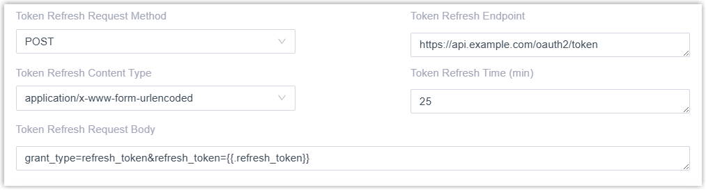 Setting Description Triggered Event Specify the pre-configured system event that triggers this request. Request Method Select the HTTP method for the API request. URL Enter the endpoint URL for the subsequent operation. For example,https://api.example.com/rest-services/loginHeaders Define HTTP headers of the request as a JSON object. You can use {{.varname}} to insert dynamic values. For example,