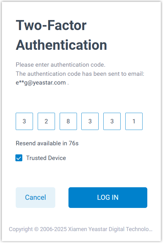 then click LOG IN.Note: For the device from which you log in most frequently, you can enable the option Trusted Devices to add it as a trusted device. In this way, you don't have to re-enter an authentication code with this device for the next 180 days.