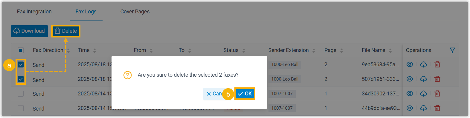 Once deleted, the fax logs and associated fax files will no longer be accessible to extension users.