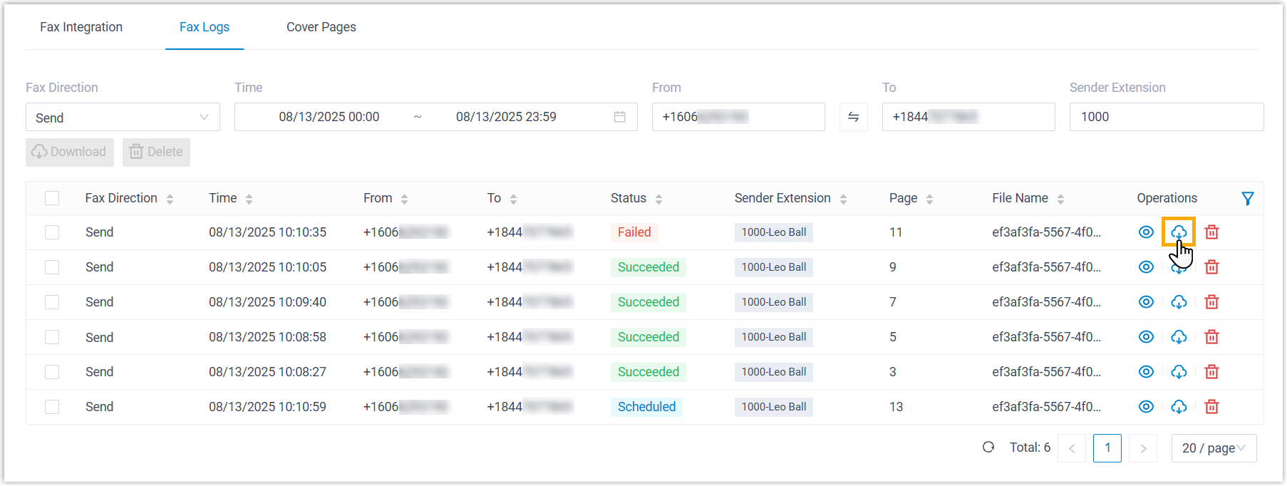 Item Description Fax Direction Select Send or Receive to filter sent or received faxes. Time Specify a time range to filter faxes sent or received within the period. From Enter the sender's fax number in E.164 format. To Enter the recipient's fax number in E.164 format. Note: For scheduled outbound faxes with multiple recipients, only the first number displayed in the list will be searched.Sender Extension Enter extension number or extension name to filter faxes sent by a specific user. - Select the checkboxes of the fax logs that you want to download, then click