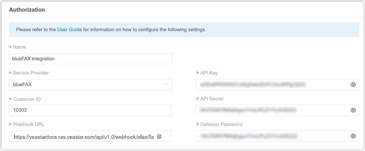 Setting Description Name Enter a name to help you identify the integration. Customer ID Paste the customer ID obtained from blueFAX. API Key Paste the API key obtained from blueFAX. API Secret Paste the API secret obtained from blueFAX. Gateway Password Paste the API secret as the gateway password. - Optional: To forward inbound faxes as email