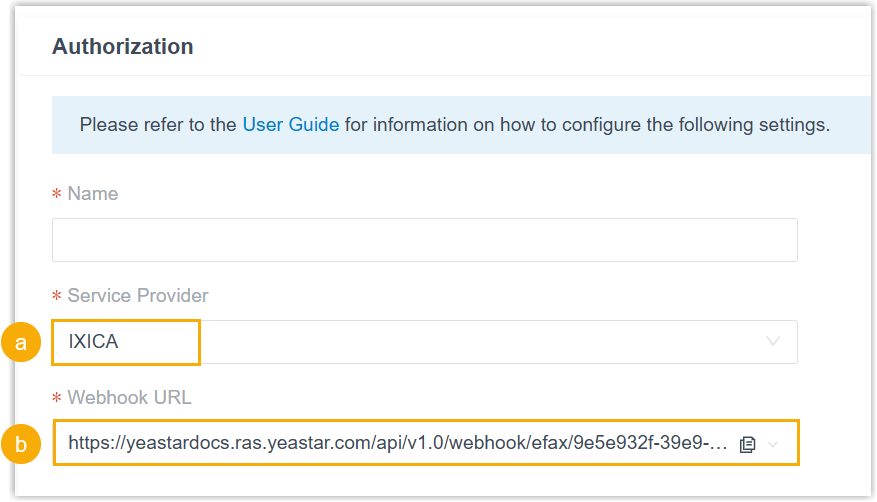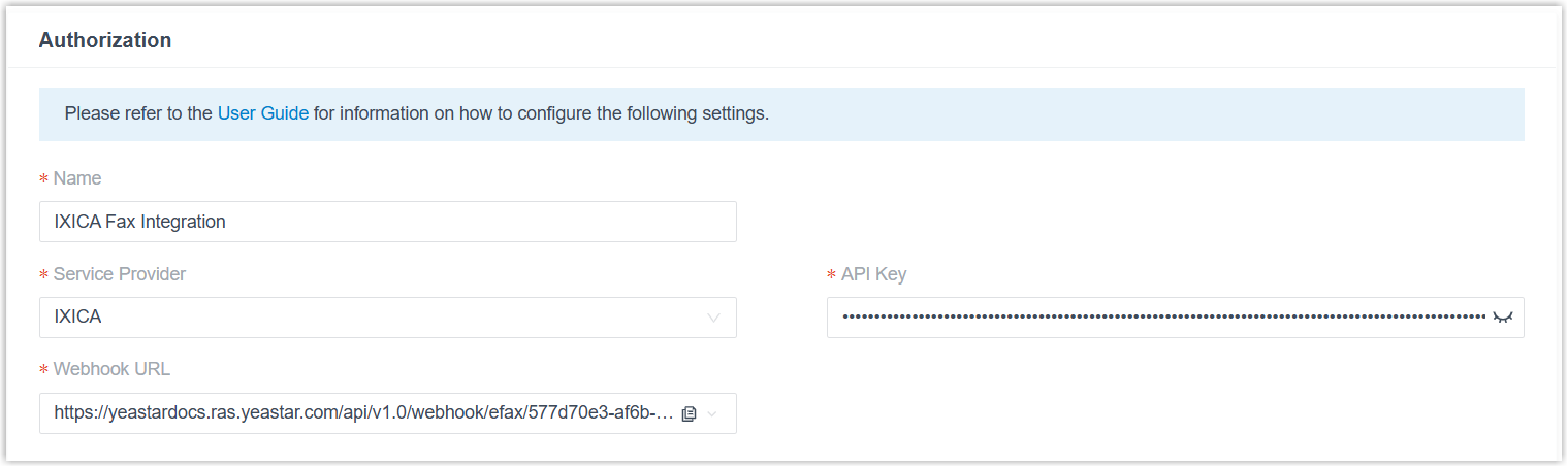 - Obtain the Webhook URL for IXICA Fax.Important: The URL will change once you leave the current page, please make sure you use the latest Webhook URL for the configuration on the service provider's customer portal.