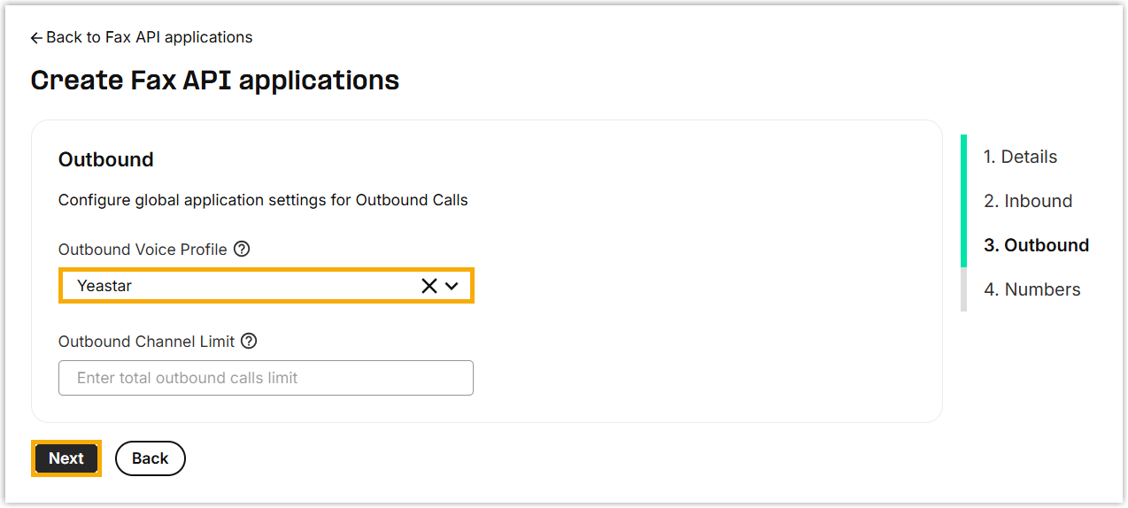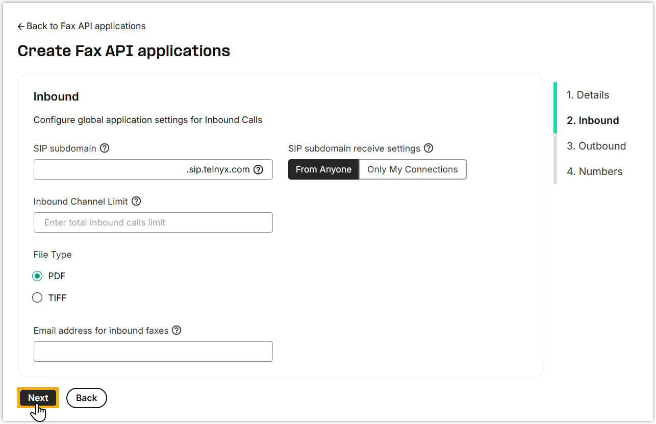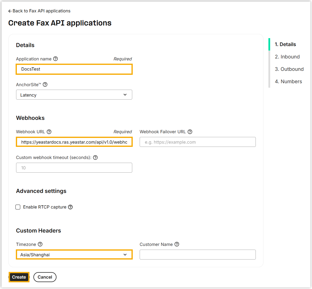 Obtain a Webhook URL from Yeastar PBX first, which is required when you set up a fax application on Telnyx.