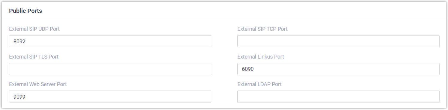 Service Internal Port External Port SIP registration UDP 5060 (default) UDP 8092 RTP UDP 10000-12000 (default) UDP 10000-12000 Web server TCP 8088 (default) TCP 9099 Linkus server TCP&UDP 8111 (default) TCP&UDP 6090