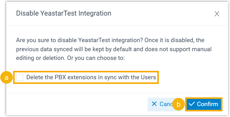 - If you want to delete the PBX extensions associated with the synced users, select the checkbox of Delete the PBX extensions in sync with the Users.
