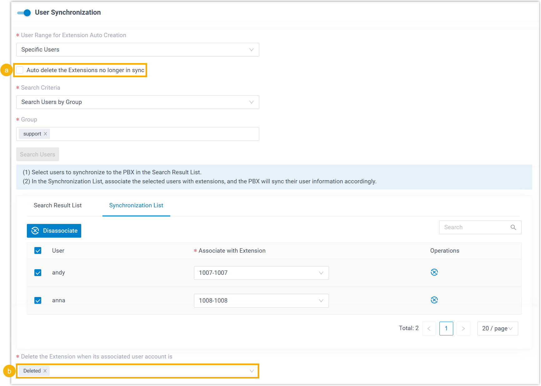 - In the Delete the Extension when its associated user account is drop-down list, select the account status(es) at which PBX will stop synchronizing the users, and delete their associated extensions.