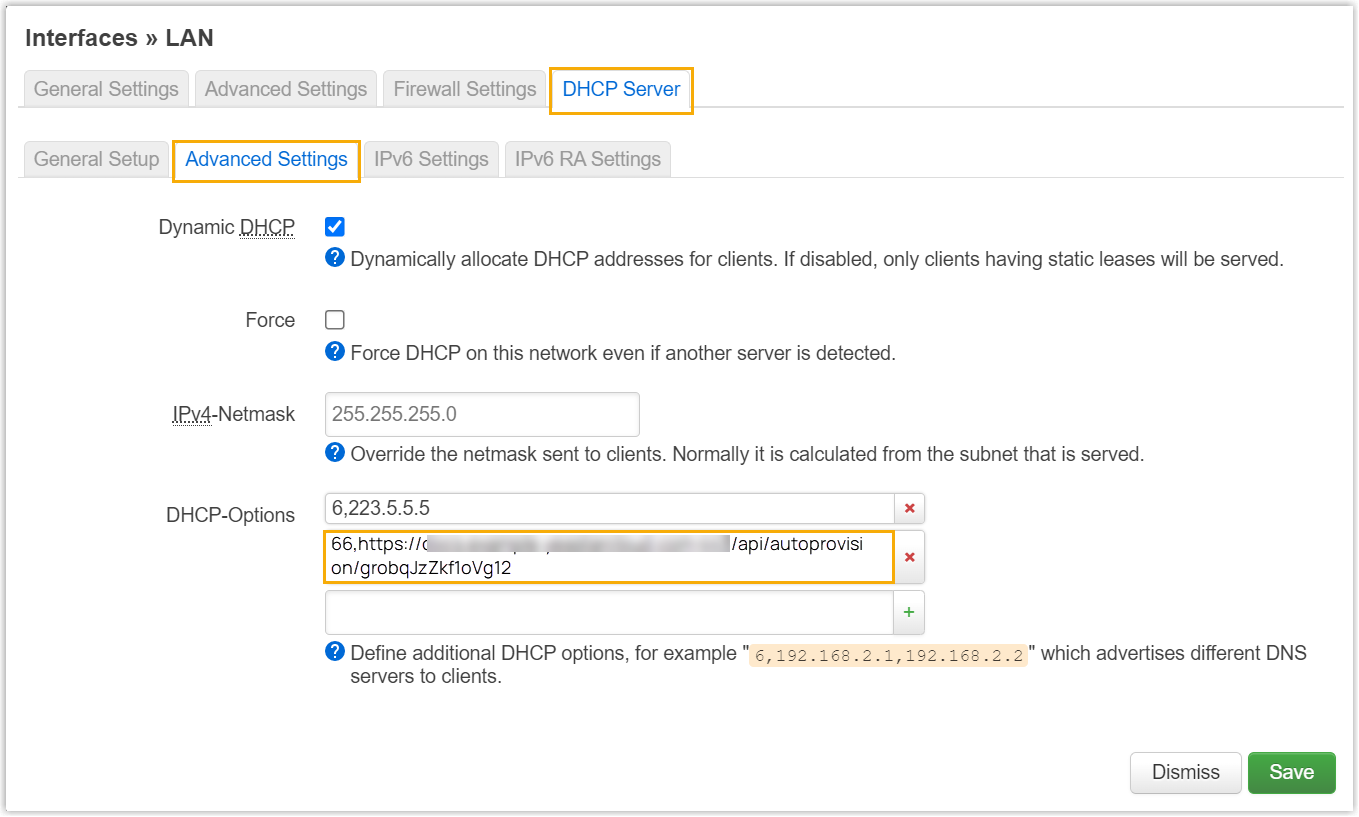 In the subnet where the IP phone is deployed, use the generated provisioning link to configure option 66 on the DHCP Server.