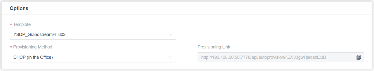 Template drop-down list.Note: You can select the default template corresponding to the model, or customize your own template. For more information, see Create a Custom Auto Provisioning Template.