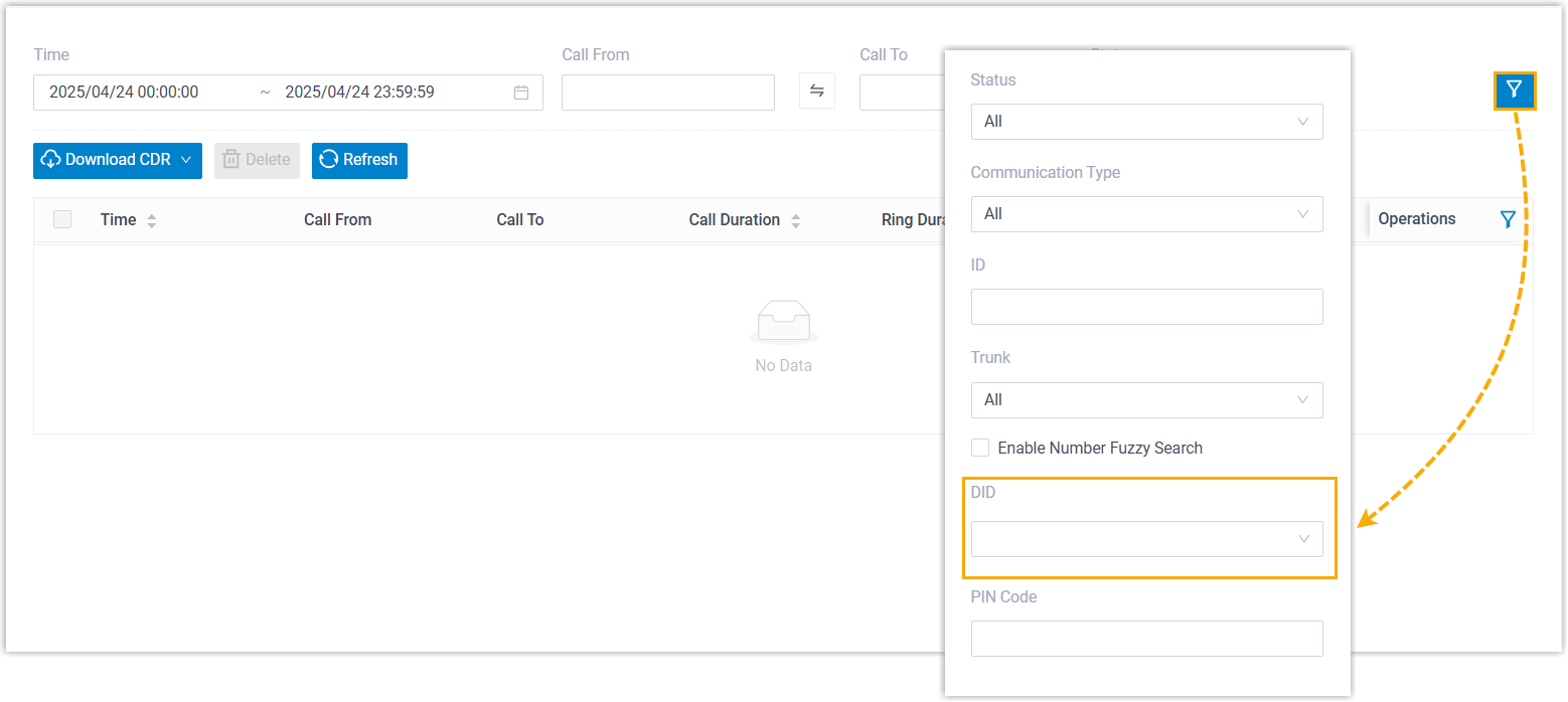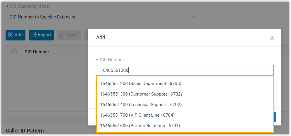 - Optimized the DID pattern setting: When DID Matching Mode is set to Match DID Range to Extension Range or DID Number to Specific Extension, you can directly select the desired DID number(s) from a list of DIDs configured on trunks, eliminating the need for manual input.